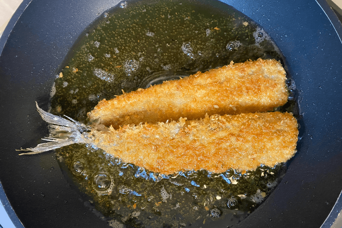 Silkę apvoliojam miltuose, mirkome kiaušinio plakinyje tuomet džiuvesėliuose ir dedame į įkaitintą keptuvę su kepimo aliejumi. Kepame silkę iš abiejų pusių kol gražiai apskrunda. Apkepus nusausiname silkę ant pipierinio rankšluosčio.