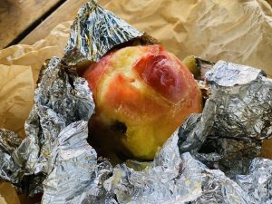 Obuolį dedame į foliją ir pilame rudajį cukrų. Suviniojame. Kepame ant grotelių ar orkaitėje kol iškeps. (apie 20min). Tuomet išviniojame obuolį iš folijos ir išimame minkštimą, palikdami sėklas ir luobelę. Maišome minkštimą su druska, maltu kuminu, baltu pipiru.