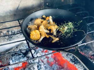Į įkaitintą keptuvę dedame sviestą. Sviestui pradėjus tirpti sudedame voveraites ir čiobrelį. Kepame apie 3 minutes nuolat maišydami. Dedame žaliasias pupas ir kepame dar porą minučių. Barstome druska ir pipirais