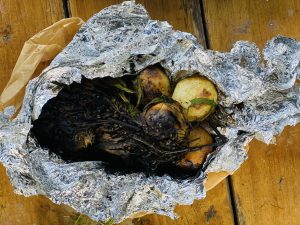 Bulvytes viniojame į foliją kartu su kanapių stiebu ( ar barstome grūstomis kanapių sėklomis) ir dedame kepti į žarijas (ar 160 laipsnių temperatūros orkaitę) kol iškeps (apie 20-25 min). Iškepus išviniojame iš folijos, patraiškome šakute ir uždėja sviestą ant bulvių nubarstome druska. Leidžiame sviestui ištirpti.