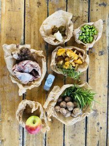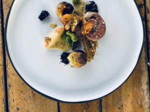 Į lėkštę dedame truputį dijon tipo garstyčių, tris juodojo česnako skilteles ir šaukštą obuolių košės. Tuomet dedame kelias keptas bulves, voveraites su pupomis, iberico kiaulienos plumo suktinį (jį dekoruojame druskos dribsniais) ir užpilame padažu.