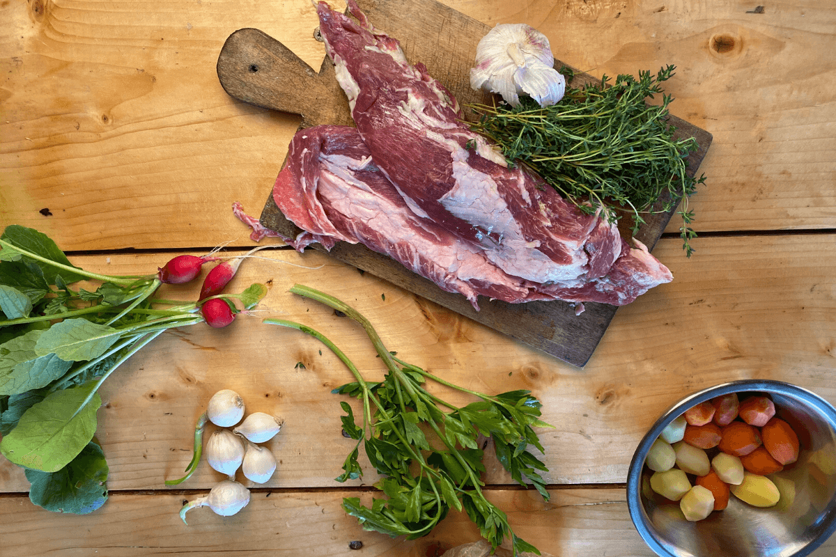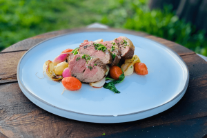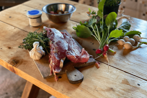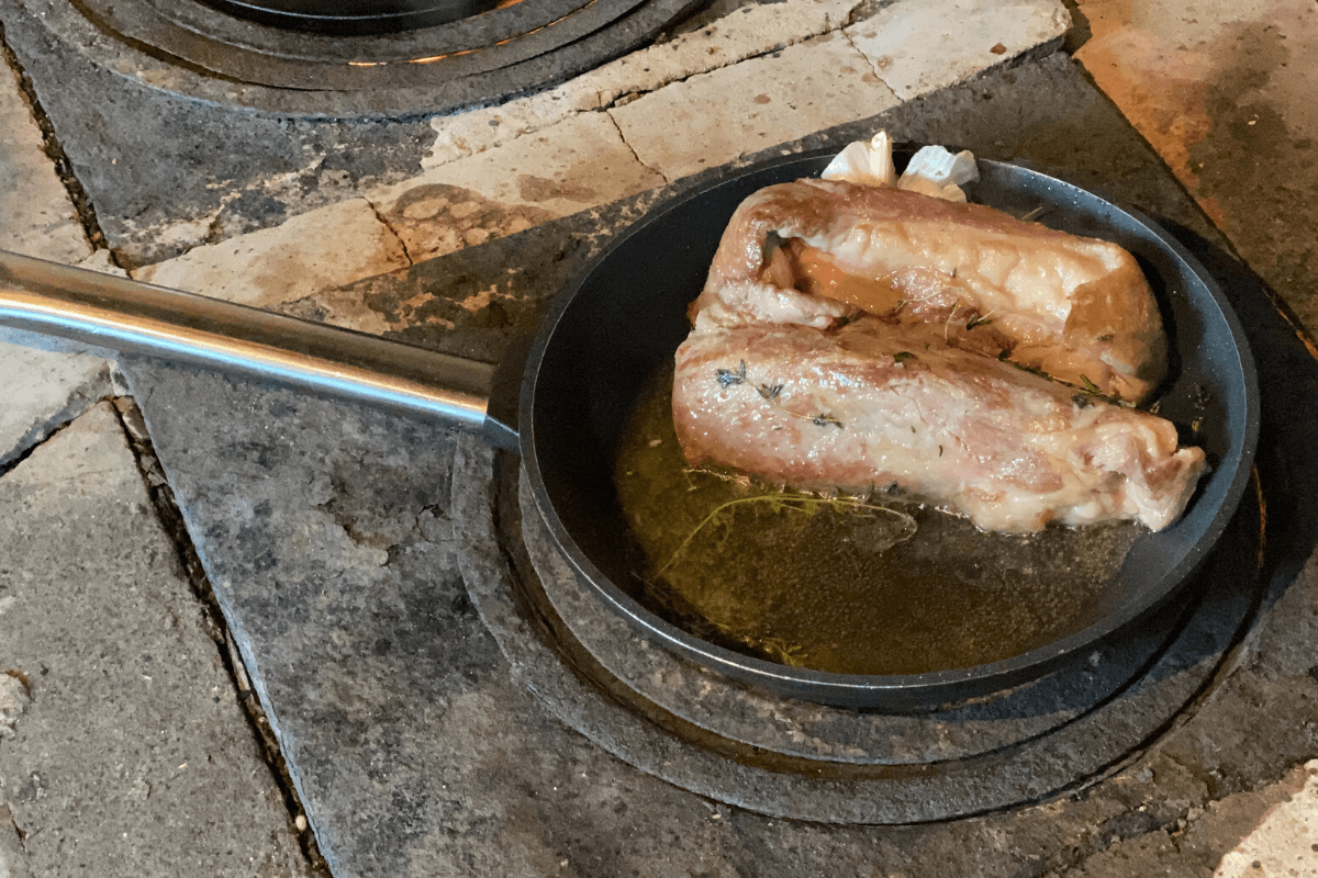 Į įkaitintą keptuvę (kaitra vidutiniškai aukšta) pilame alyvuogių aliejaus, dedame kiaulienos plumo steikus, čiobrelio šakeles ir perpus pjautą česnaką. Karamelizuojam (apkepam) mėsą iš visų pusių stengdamiesi kepti pastoviai vartant ir vienodą laiką, kad apkepimas būtų tolygus.Ištraukiam mėsą iš keptuvės ir paliekam pailsėti 10minučių. Tuomet dedame apkeptą kiaulieną į orkaitę (180laipsnių) ir kepam iki kol vidinė temperatūra pasieks 58laipsnius, (10-12 min). Tuomet ištraukite kiaulieną ir leiskite mėsai pailsėti prieš pjaustant griežinėliais apie 4-5min, tai leis sultims sugryžti į mėsos centrą, tad mėsa bus tolygiau iškepusi. (Po poilsio mėsos vidinė temperatūra bus apie 68laipsnius).