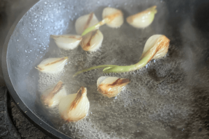 Į keptuvę ar mažą puodą pilame 30ml vandens, 30ml balto vyno acto ir 30g cukraus, užverdame ir išsisaugome sirupą. Svogūnėlius nulupame, pjauname perpus ir dedame į įkaitintą keptuvę su trupučiu alyvuogių aliejaus pjauta puse į keptuvę, svogunėliams apskrudus pilame pasigamintą sirupą ir užglazuruojam svogūnus. Prieš dedant į lėkštę 4 minutes pašildome orkaitėje (180laipsnių).