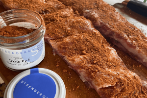 išbandžiau Steenbergs Creole prieskonių mišinį, kuris jį paskanavus, kiek nugąsdino permušančiais kajeno pipirais, bet galutiniame rezultate jie buvo nestipriai jaučiami. Paruoštus šonkaulius susukau į maistinę plėvelę ir dedame į šaldytuvą, paliekame marinuotis per naktį.