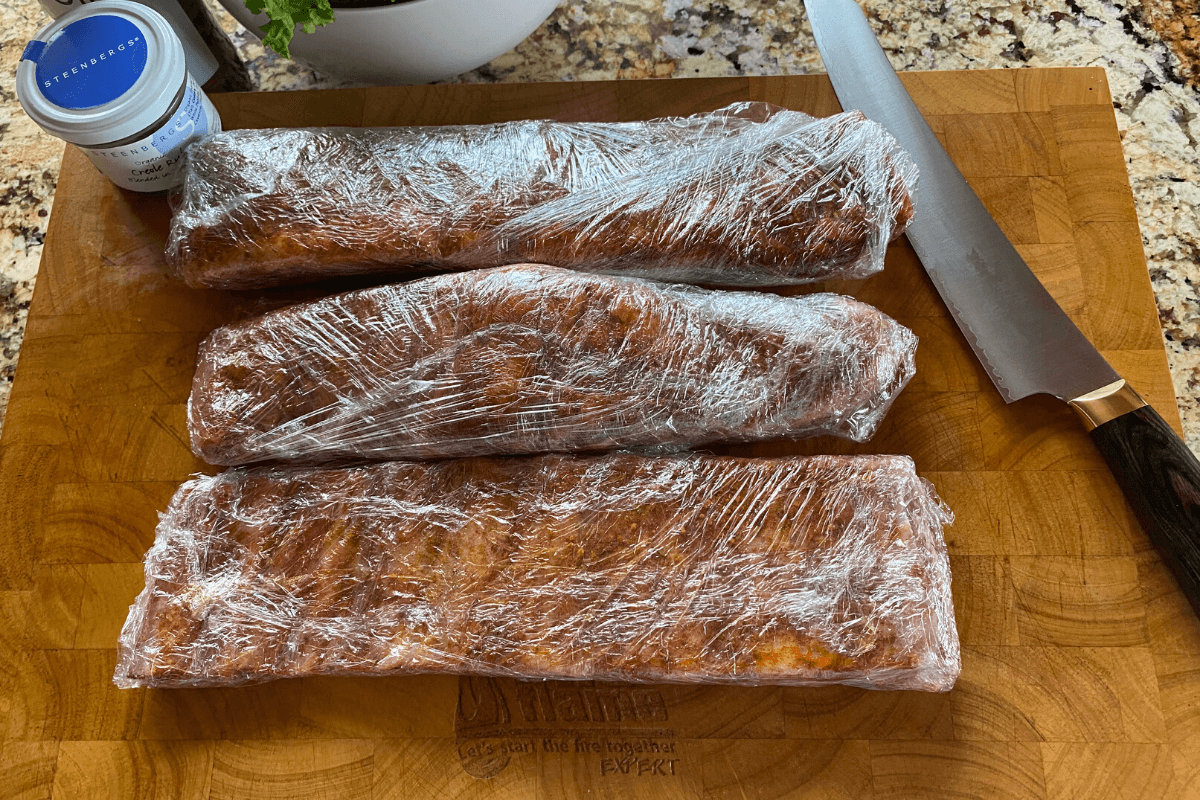 išbandžiau Steenbergs Creole prieskonių mišinį, kuris jį paskanavus, kiek nugąsdino permušančiais kajeno pipirais, bet galutiniame rezultate jie buvo nestipriai jaučiami. Paruoštus šonkaulius susukau į maistinę plėvelę ir dedame į šaldytuvą, paliekame marinuotis per naktį.
