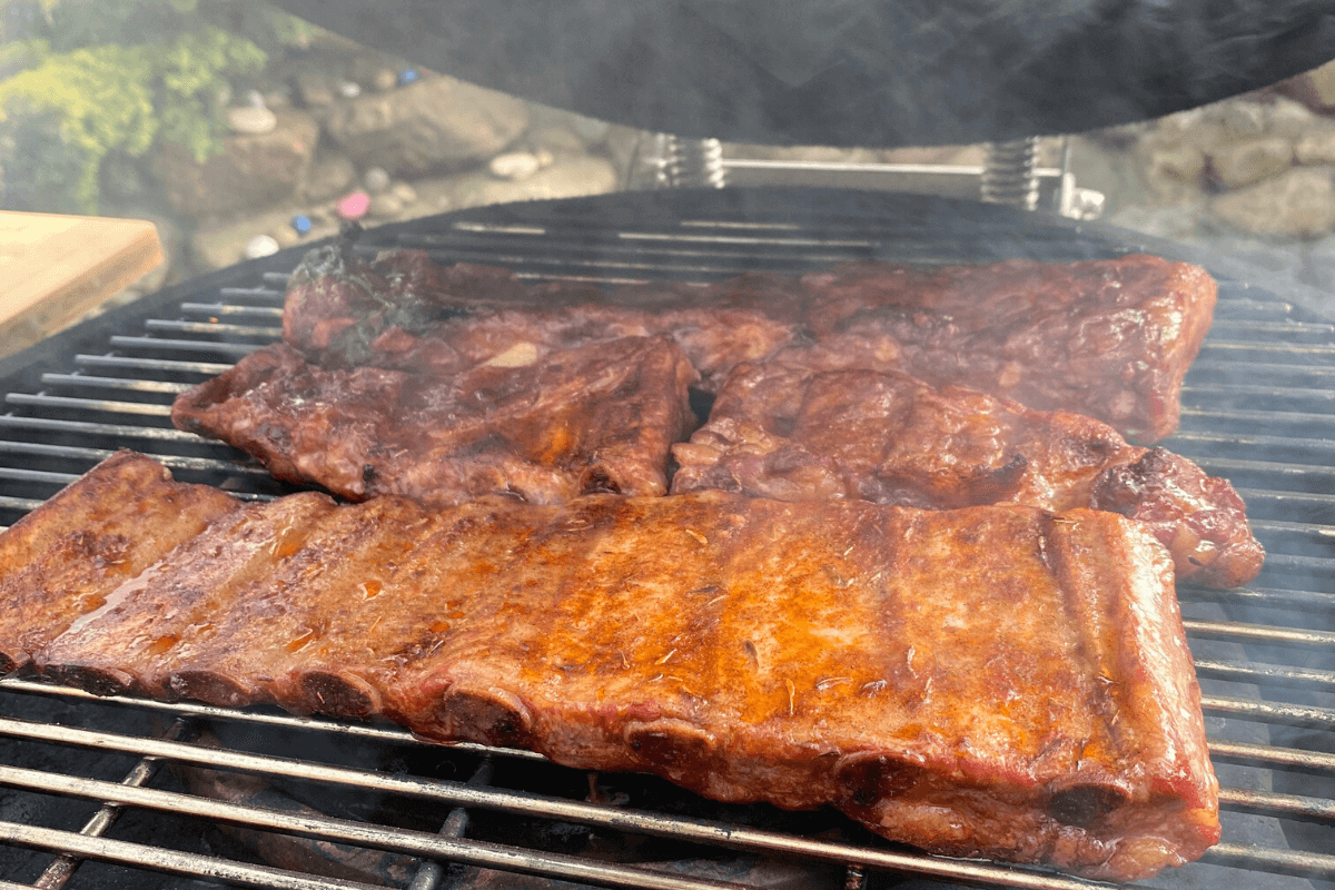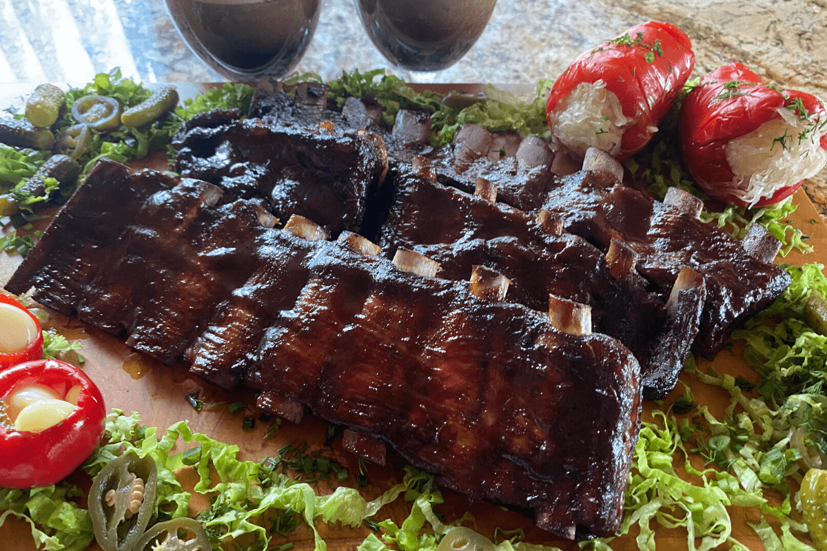 Tada šonkaulius išvyniojau ir patepiau BBQ padažu. Patepęs padažu dar kepiau 10 -15 minučių. Ištraukus iš kepsninės kelias minutes leidau šonkauliams pailsėti ir mėgavausi puikiu Iberico skoniu!