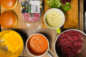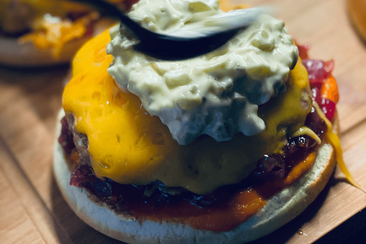 Bandeles apskrudinam orkaitėje. Tepame ant jos pagamintą pomidorų padažą, dedame karamelizuotus svogūnus, mėsą, tuomet agurkėlių/jalapenų majonezinį padažą, salotų lapelius ir uždedame antrą bandelės pusę.