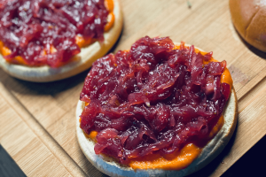 Raudoną svogūną nulupame ir pjaustome pusžiedžiais. Dedame į puodą kartu su sviestu ir kepame kol suminkštėja. Tuomet pilame raudono vyno actą, cukrų ir troškiname apie 40min. Tuomet dedame grūdėtas garstyčias ir viską permaišome.