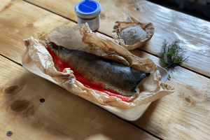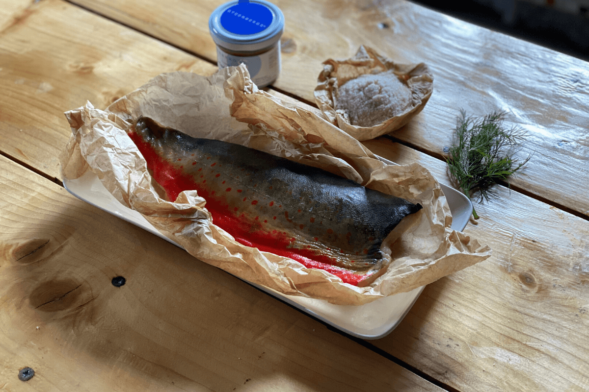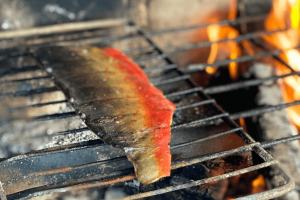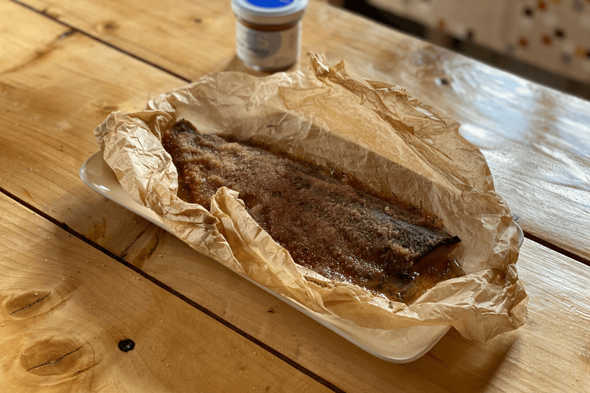 Dedame ant griliaus ir kepame ant vėsios kaitros kol žuvis pasiekia 48laipsnių temperatūrą .(Alternatyva griliui orkaitėje 140 laipsnių temperatūroje, tik tuomet prarasime dūmo aromatą arba galite naudoti rūkytą druską).
