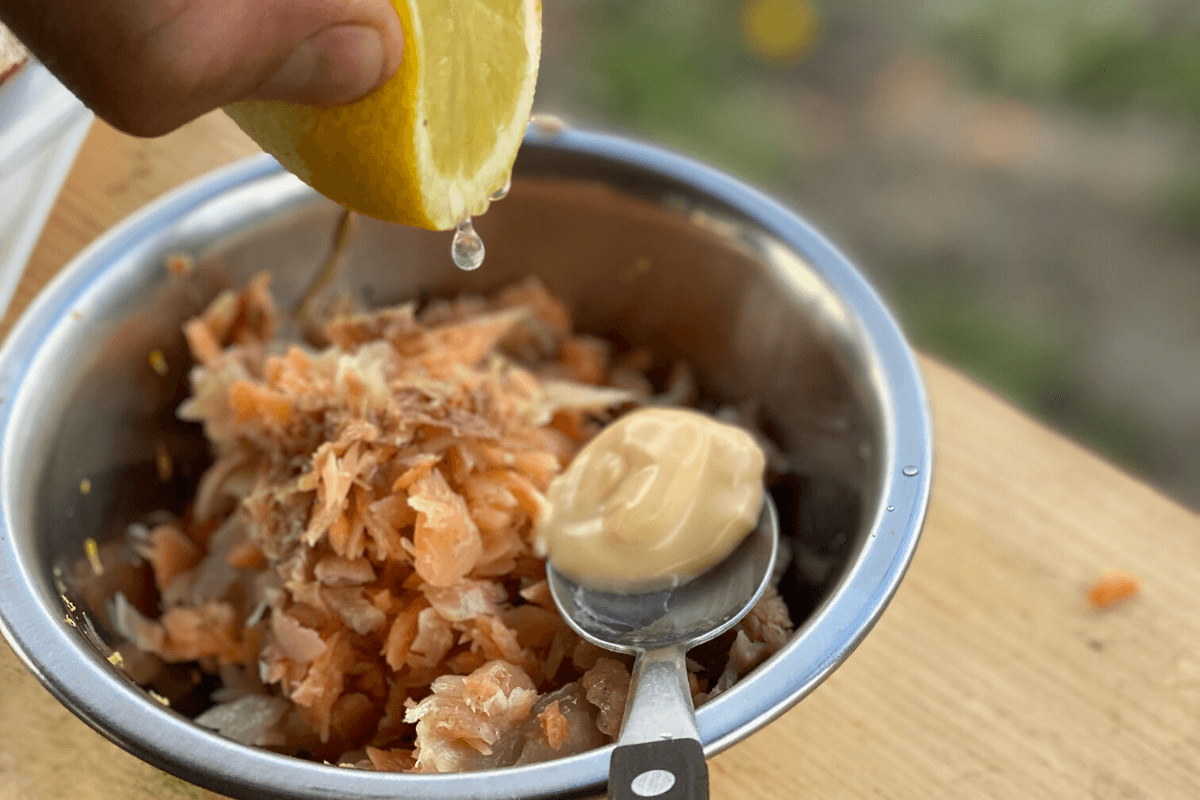 Iškeptą žuvį atvėsiname, tuomet “draskome” šakute mažomis atplaišomis.