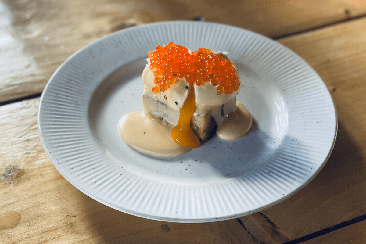 Keptuvėje apskrudinam brioche duonos riekę ir dedame ją į lėkštę. Ant šios dedame minkštai virtą kiaušinį, pilame olandišką padažą, ant šio dedame šaukštą ikrų.