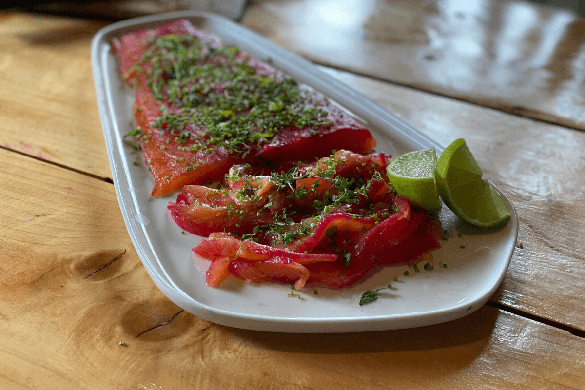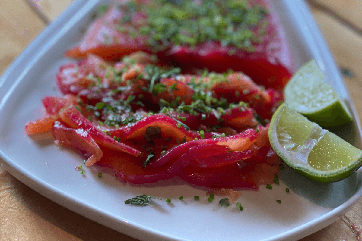 Po 12 valandų pašaliname burokėlius ir ištraukiame lašiša iš druskos mišinio(šis atrodys drėgnas). Lašišą nuplauname šaltu vandeniu ir nusausiname. Pjaustome plonais griežinėliais pašalinę odą jei to nepadarėme anksčiau. Prieš valgant ant viršaus galime pabarstyti smulkintų žolelių bei pagardinti užspausdami citrinos ar laimo sulčių.
