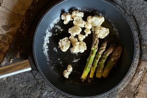 Į keptuvę dedame 25g sviesto, česnaką ir likusias čiobrelio šakeles. Dedame skustus smidrus pjaustytus 4-5cm ilgio stiebeliais, 1/5tajä išsaugoto kalafioro, beriame 2g druskos ir kepame kol gražiai apskrus ir suminkštės(apie 5-6min ant vidutinės kaitros).