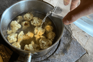 Į puodą dedame 10g sviesto, 2 šakeles čiobrelio ir ant vidutinės kaitros apkepame smulkiai pjaustytą šalotinį svogūną iki šis paruduos ir suminkštės. Dedame šakelėmis atskirtą kalafijorą (išsisaugome 1/5 apkepimui) ir truputį pakepame kartu su svogūnu. Pilame vandens, kad apsemtu kalafiorus ir verdame kol šie taps minkšti. Tuomet nupilame vandenį, išimam čiobrelio šakeles ir traiškome kalafiorus kočėlu ar plakame rankiniu blenderiu jei norit švelnesnės tekstūros. Įmaišome 40g šalto kubeliais pjaustyto sviesto, supilame grietinėlę, dedame druskos ir užšildome maišydami.