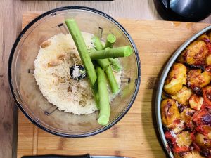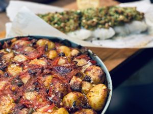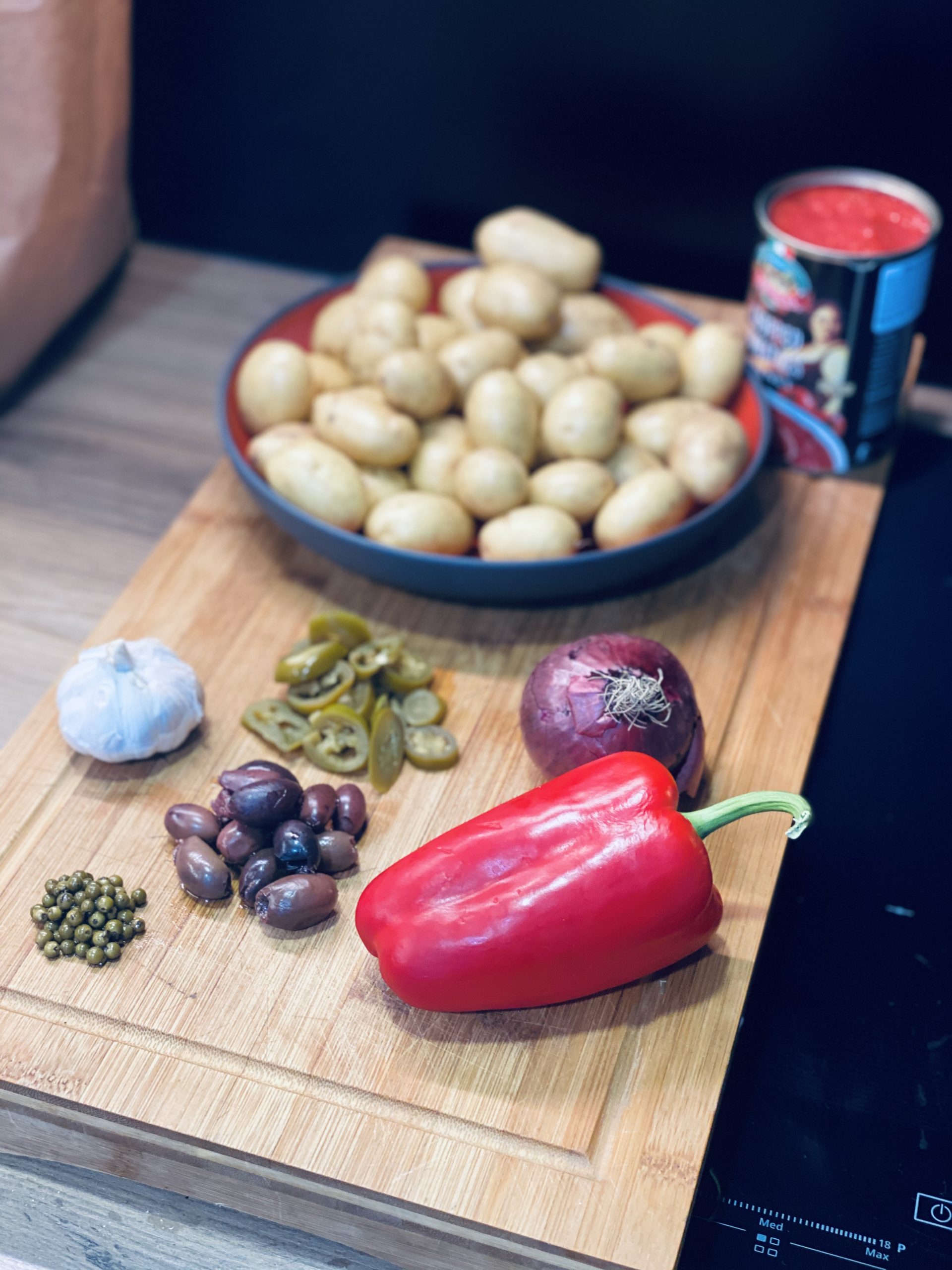 Raudoną papriką nusilupame ir pjaustome juostelėmis. Česnaką nusilupame ir dedame Į kepimo indą kartu su bulvėmis, riekelėmis pjaustytas alyvuogėmis, paprika. Taip pat dedame juostelėmis pjaustytą raudonąjį svogūną, pilame aliejų, konservuotus pomidorus bei raudono vyno actą. Viską permaišome. Pabarstome druska ir dedame į orkaitę 190laipsnių apie 40min ar kol bulvės iškeps. Ištraukiam iš orkaitės, patraiškome bulves kočėlu, barstome druską dribsniais ir kišame atgal į orkaitę kad bulvės apskrustų.
