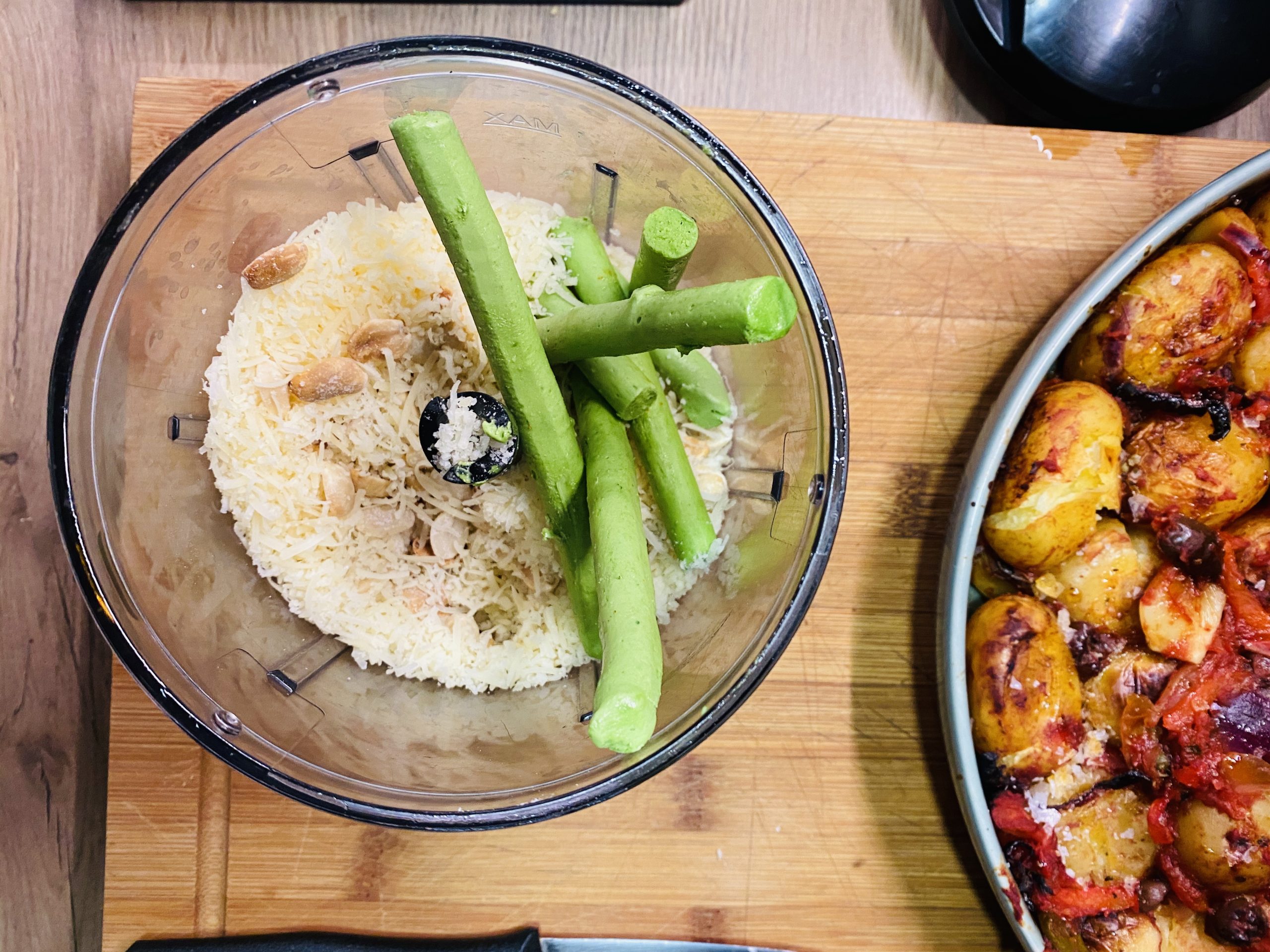 Virtuviniame kombaine sumalame sviestą, 20g petražolių, kietajį sūrį ir žemės riešutus iki vientisos masės(Tačiau riešutai gali likti skirtingų dydžių). Spaudžiame citrinos sulčių pagal skonį ir jei reikia idedame druskos.