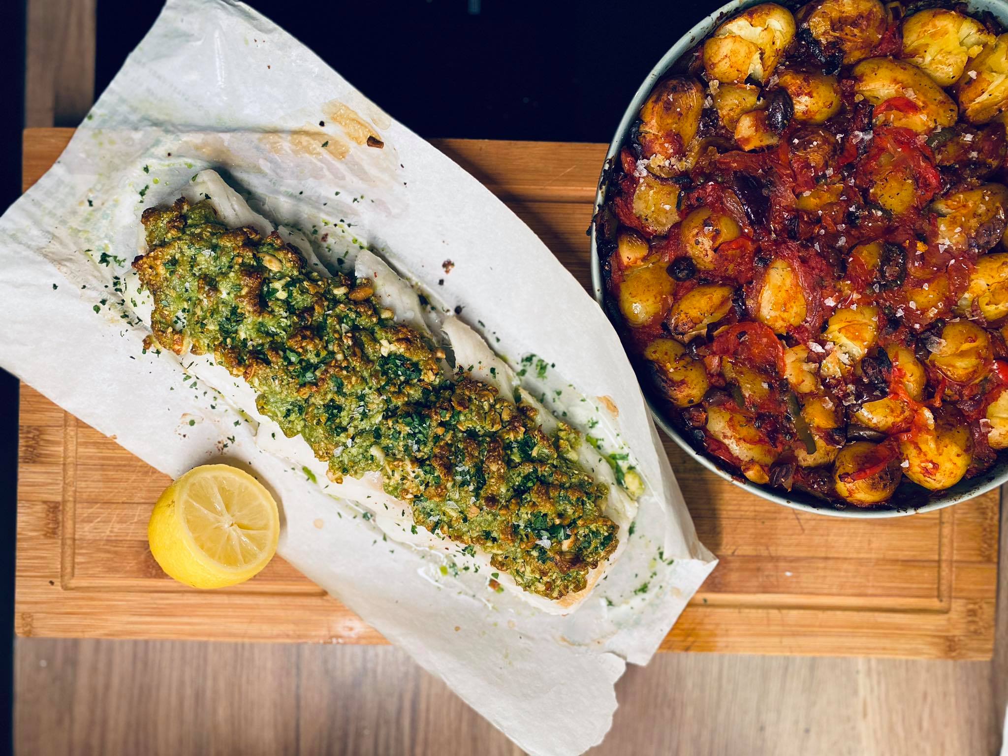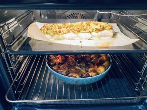 Dedame menkę į kepimo skardą, ant jos tepame sviesto masę su riešutais ir petražolėmis. Dedame į 190laipsnių orkaitę ir kepame iki vidinė temperatūra pasieks 48-52laipsnius(apie 10-13 min.) .Ištraukiam iš orkaitės, barstome likusiomis petražolėmis(pasmulkintomis) ir leidžiame pailsėti 5-7min iki keliaus ant stalo.