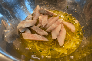 Šalotinį svogūną pjaustome plonais pusžiedžiais ir dedame juos į dubenį. Pilame alyvuogių aliejų, dedame druską, cukrų, kalendrą, kuminą nuskabome čiobrelio lapelius ir išmaišome.