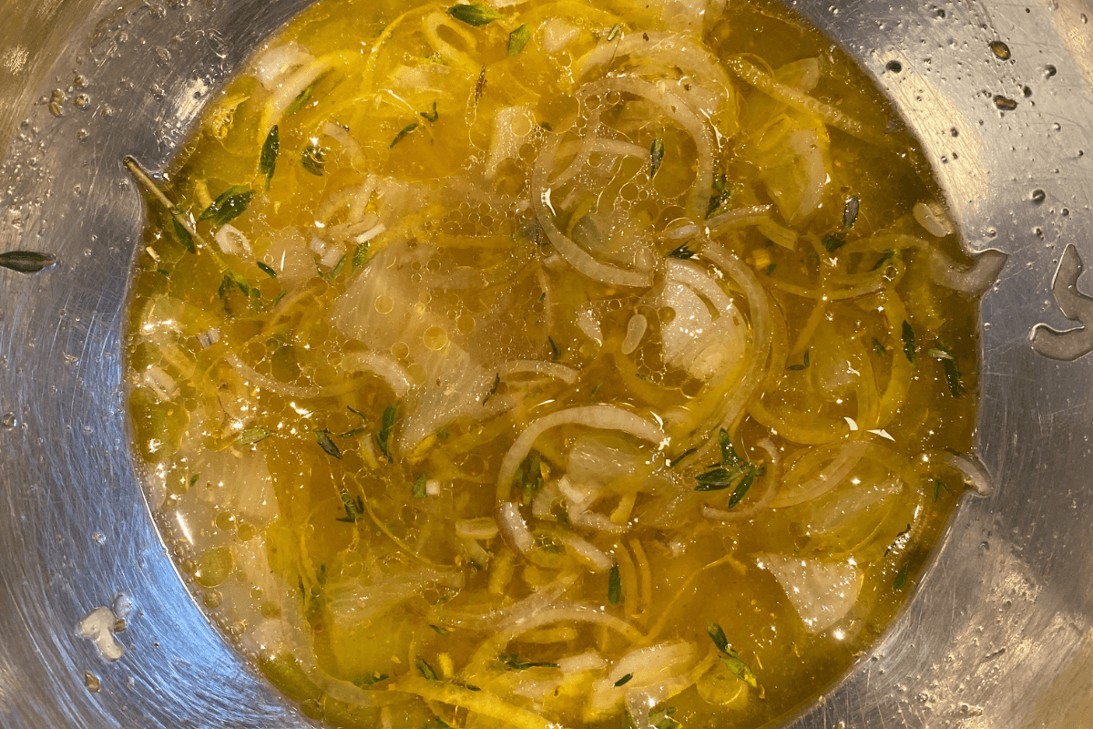 Šalotinį svogūną pjaustome plonais pusžiedžiais ir dedame juos į dubenį. Pilame alyvuogių aliejų, dedame druską, cukrų, kalendrą, kuminą nuskabome čiobrelio lapelius ir išmaišome.