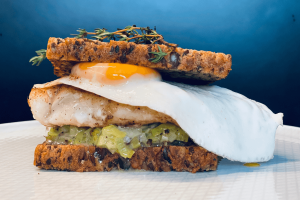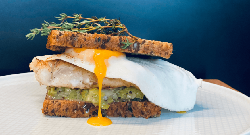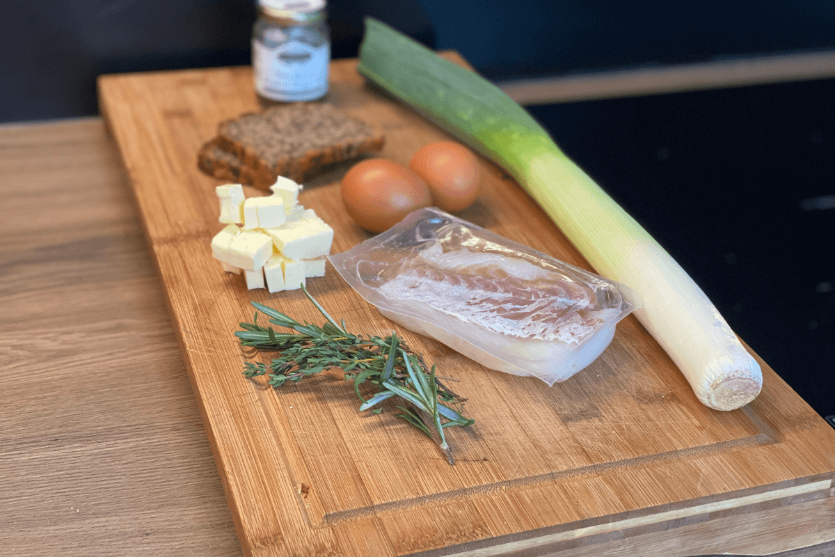 Ant šios dedame troškintus porus su trumais, žuvį ant šios kiaušinį ir galiausiai kitą riekę paskrudintos duonos.