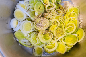 Poro šviesiąją dalį pjaustome riekelėmis ir kepame jas prikaistuvyje ištirpintame svieste(25g) nuolat ant vidutinės kaitros kol šie truputi apskrunda ir sutrokšta.