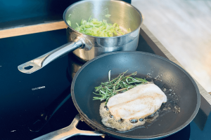 Žuvį nusisausiname, padruskiname, papipiriname ir dedame apkepti į keptuvę(kaitra vidutiniškai aukšta) iš abiejų pusių ant sviesto su rozmarinu ir čiobrelio šakele. Apkepus dedame ant trokštančių porų ir paliekame tol kol pasiekia 48-52 laipsnius vidinę temperatūrą.